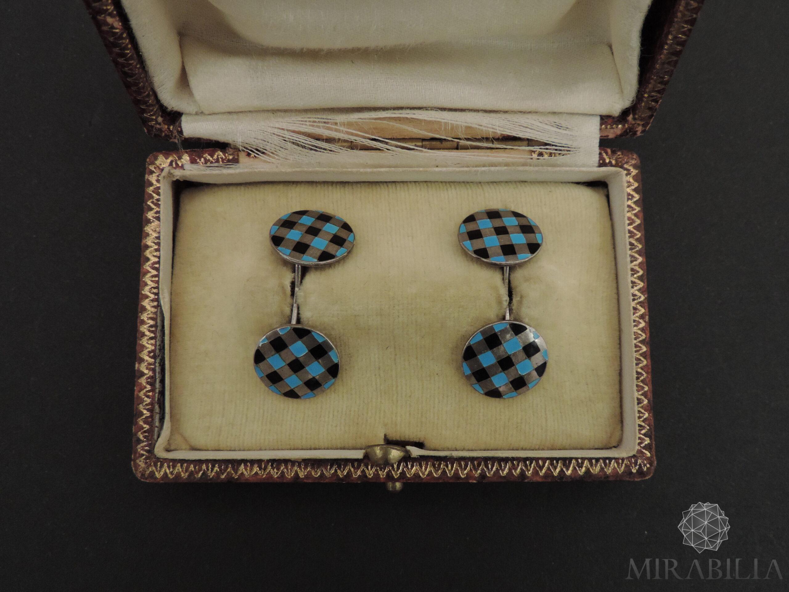 Coppia di gemelli da uomo "a catena" in argento 800 (punzonati), decorati con smalti originali azzurri e neri, a motivi geometrici (in ottimo stato di conservazione). Realizzati negli anni '30, in piena epoca razionalista, presentano una decorazione sobria ed essenziale, tipica del periodo.
