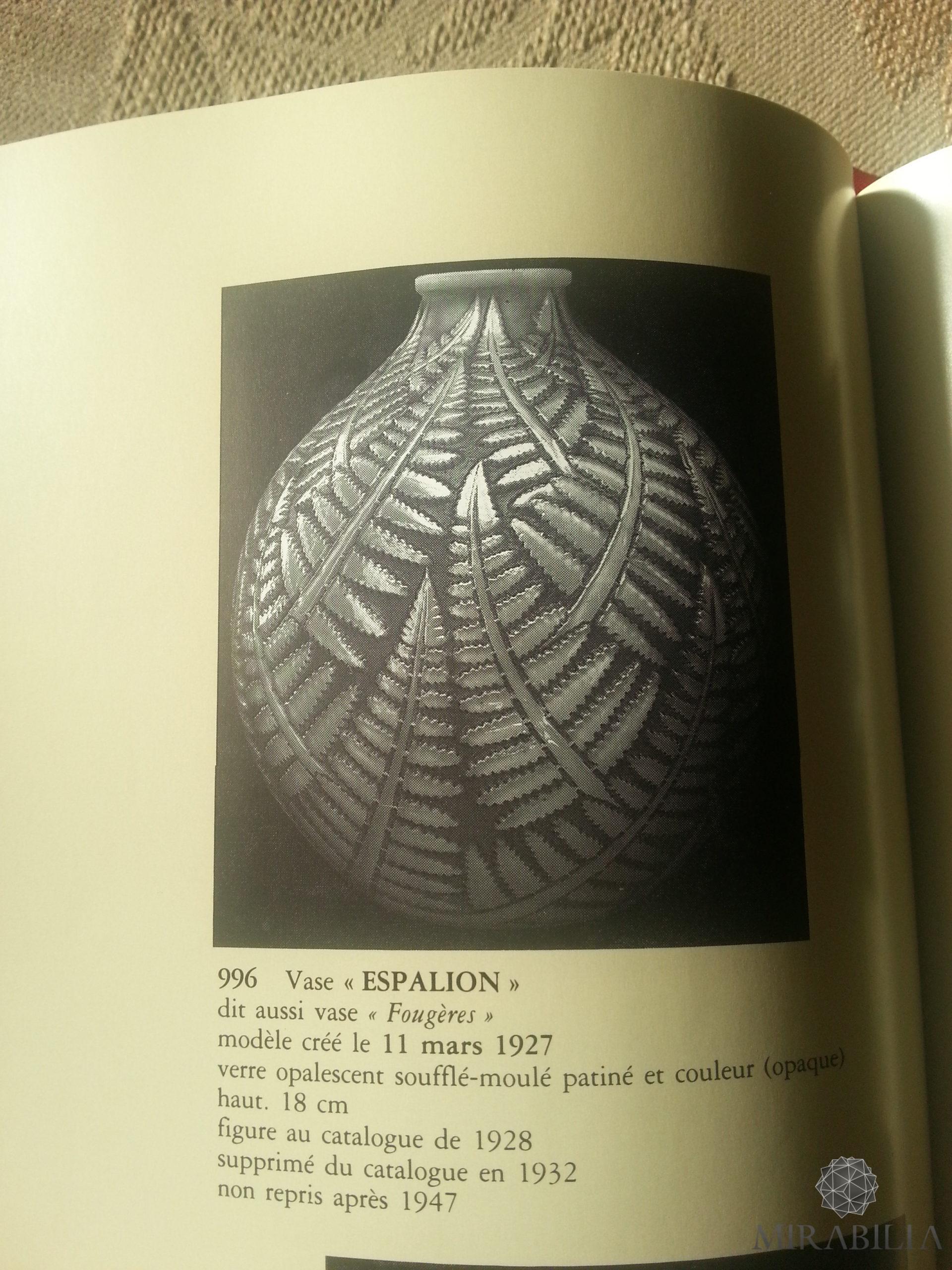 Il vaso è firmato, sotto la base, R. Lalique France e citato a pagina 438, nel libro "R. Lalique, catalogue raisonné de l'oevre de verre" di Félix Marcilhac, del 1989.